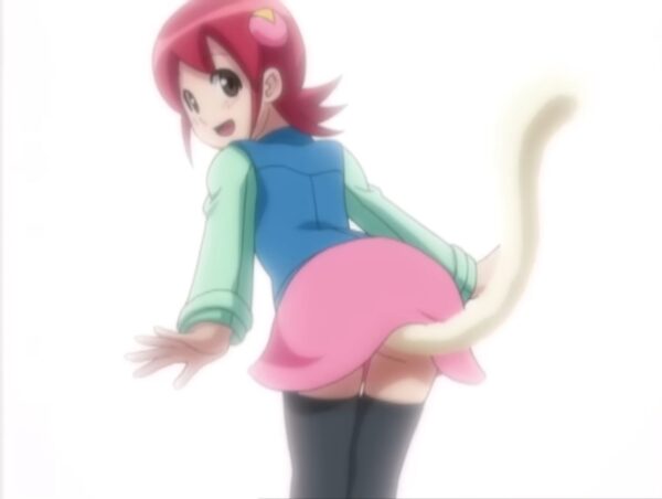 他のシーンではスカートの上から腰巻の紐にぶら下げる形で尻尾型アクセサリを装着している