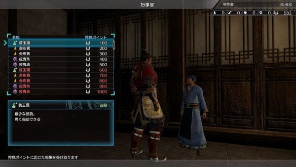 獲得した「狩猟ポイント」に応じて、好事家から古銭や宝玉といった報酬を受け取れる。